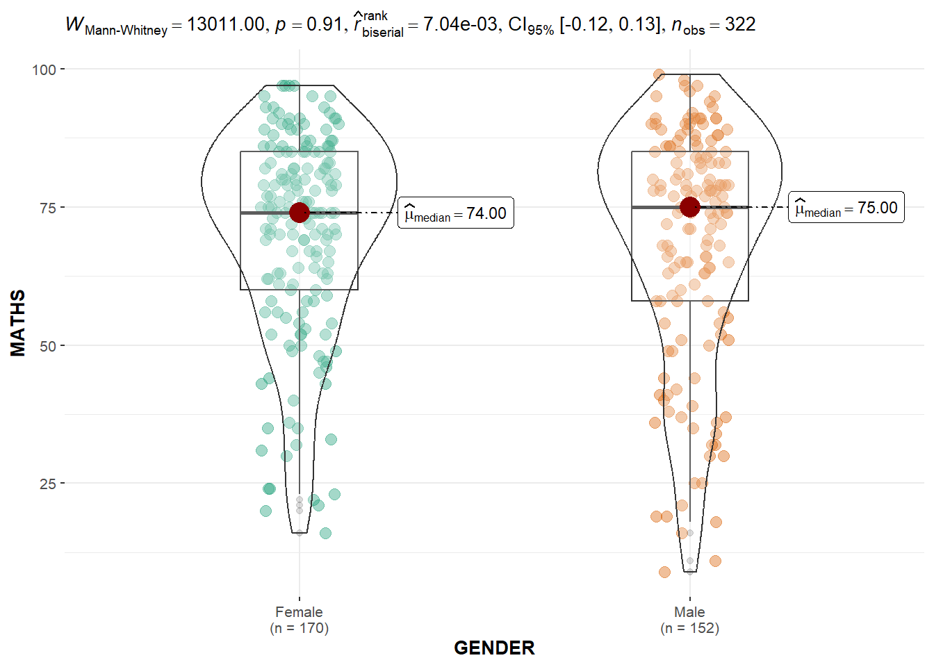 ggbetweenstats() is used to build a visual for two-sample mean test of Maths scores by gender.