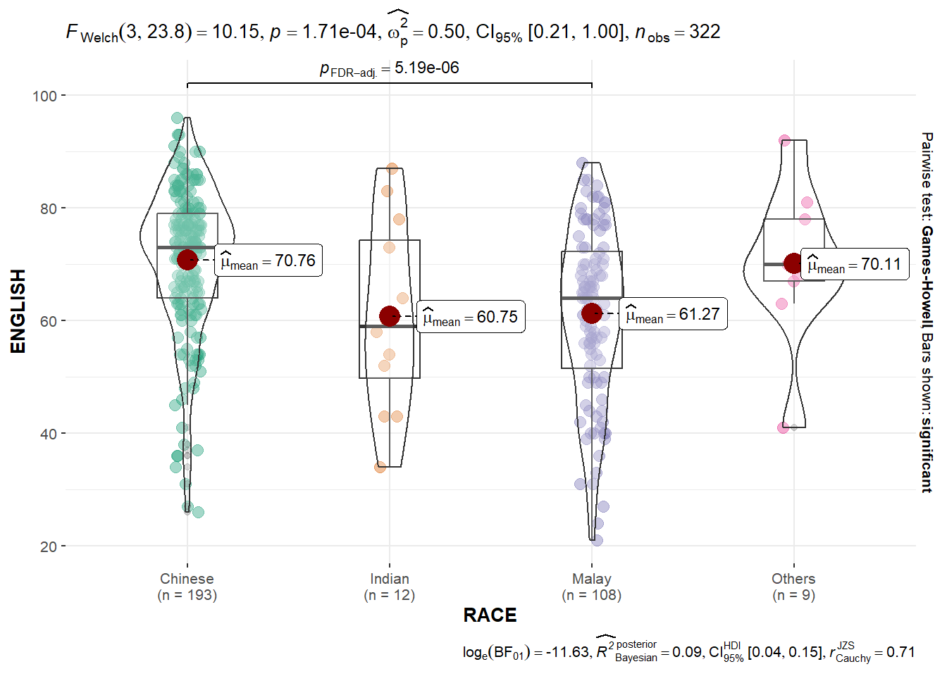 ggbetweenstats() is used to build a visual for One-way ANOVA test on English score by race