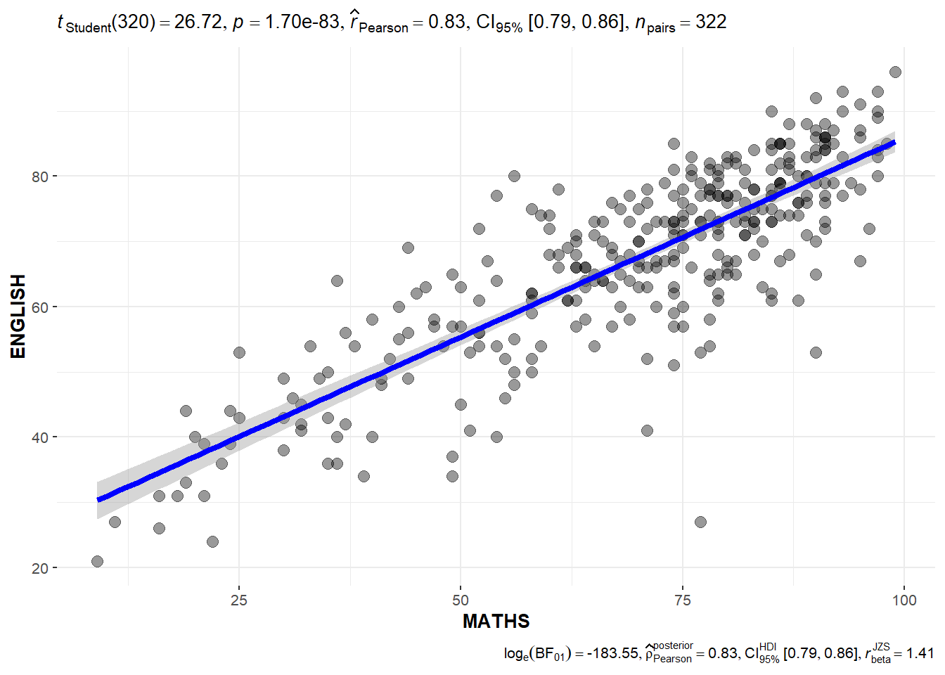 ggscatterstats() is used to build a visual for Significant Test of Correlation between Maths scores and English scores.