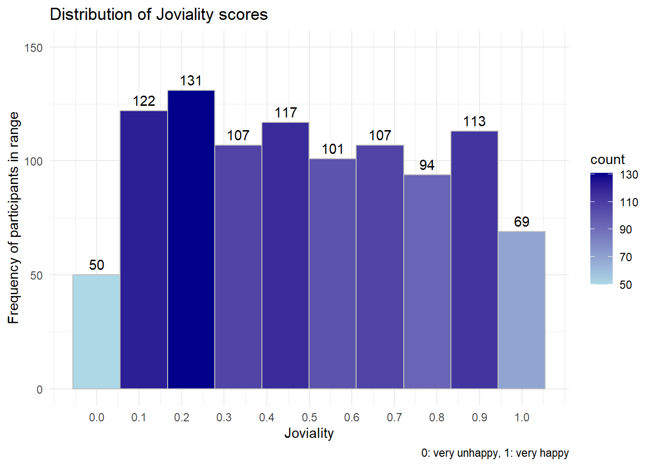 Participants$joviality <- as.numeric(Participants$joviality) #| code-fold: true