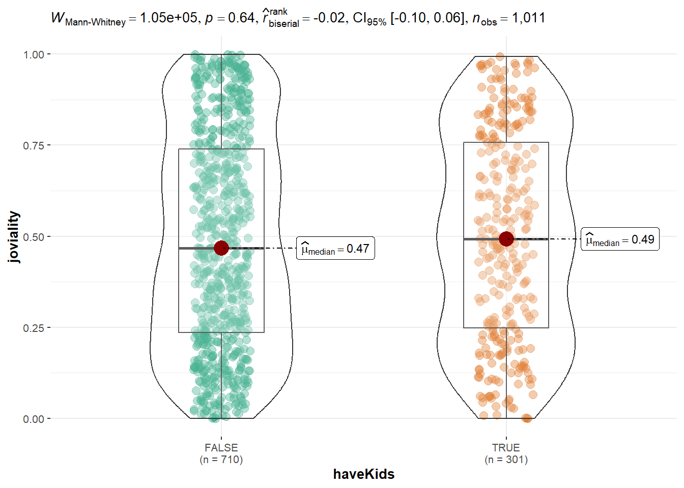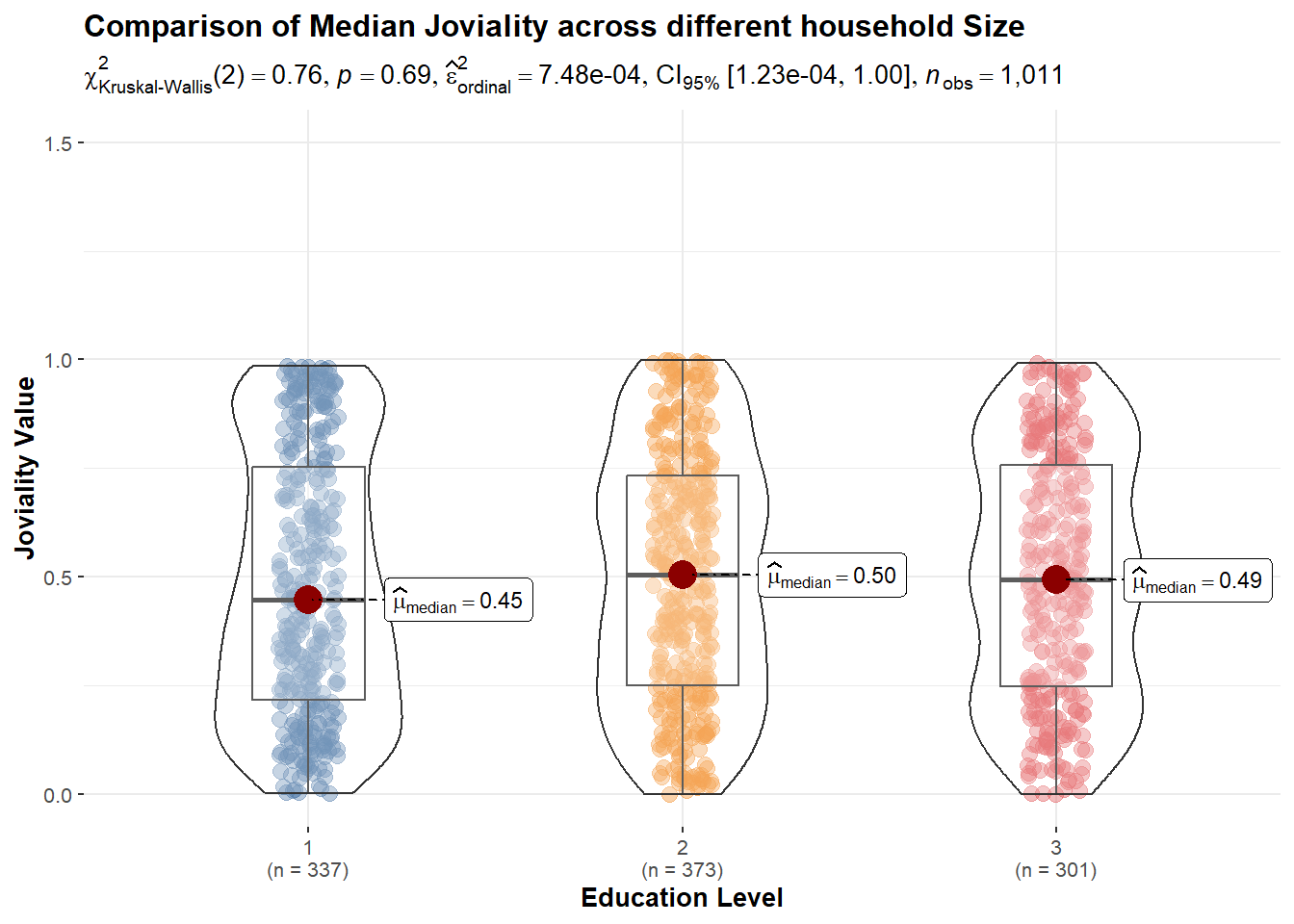 ggbetweenstats(data = Participants, x = householdSize, y = joviality,