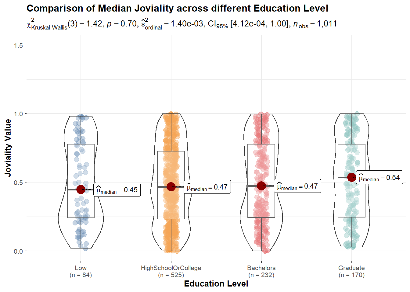 From above statistical tests, p values are all quite big. None of them is less than 0.05 and able to reject null hypothesis. So we accept null hypothesis as the differences are due to sample randomness. there’s no specific category of factor that significately affects the joviality value.