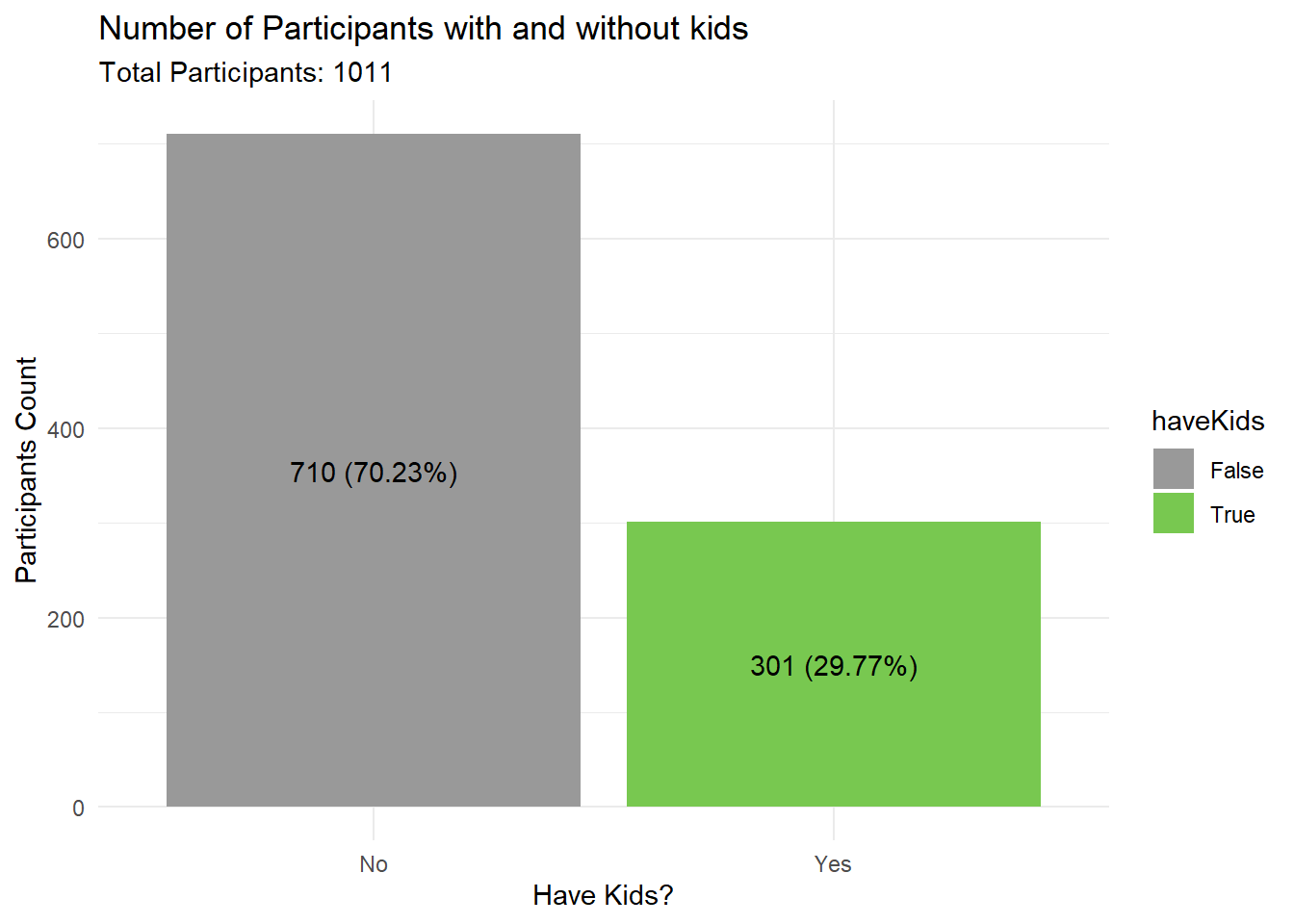 labs(x = "Have Kids?", y = "Participants Count", title = "Distribution of Participants with/without kids",subtitle = paste0("Total Participants: ", TotalParticipantCount$n)) +