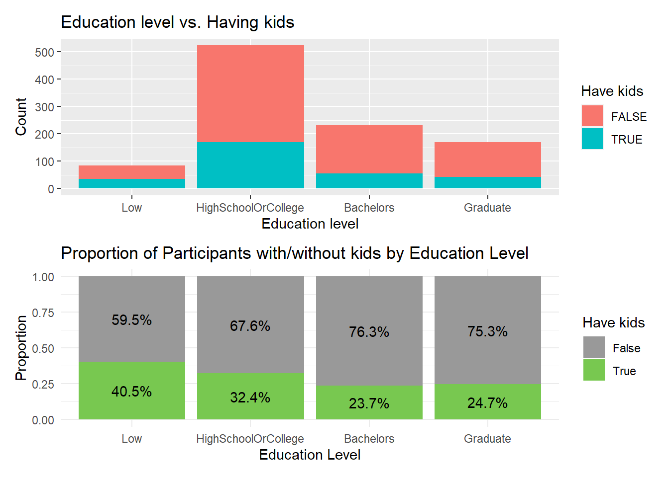 labs(x = "Education Level", y = "Proportion", title = "Proportion of Participants with/without kids by Education Level", fill = "Have kids") +