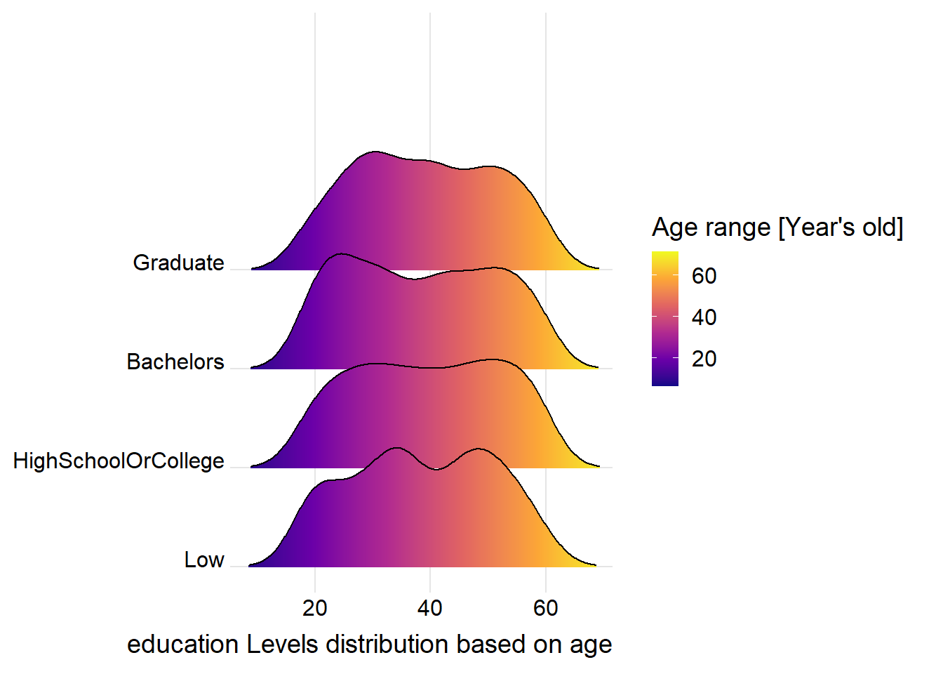 educationLevel (string factor): the participant’s education level, one of: {“Low”, “HighSchoolOrCollege”, “Bachelors”, “Graduate”} (use tidyverse to convert to factor with fix sequence)