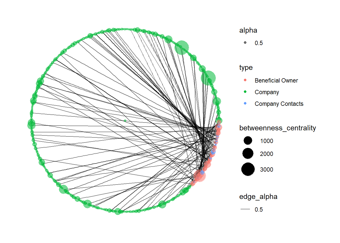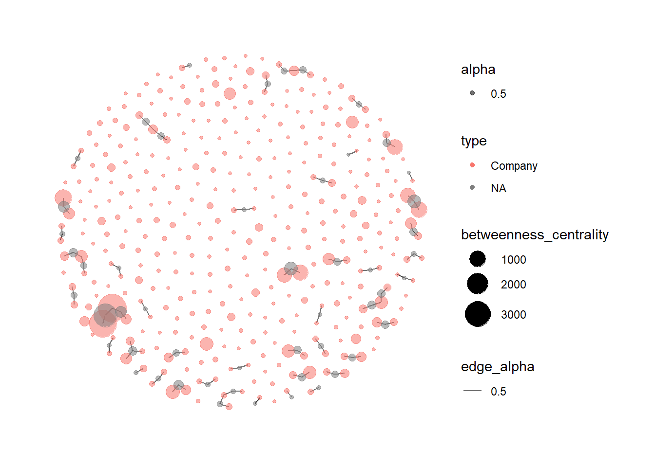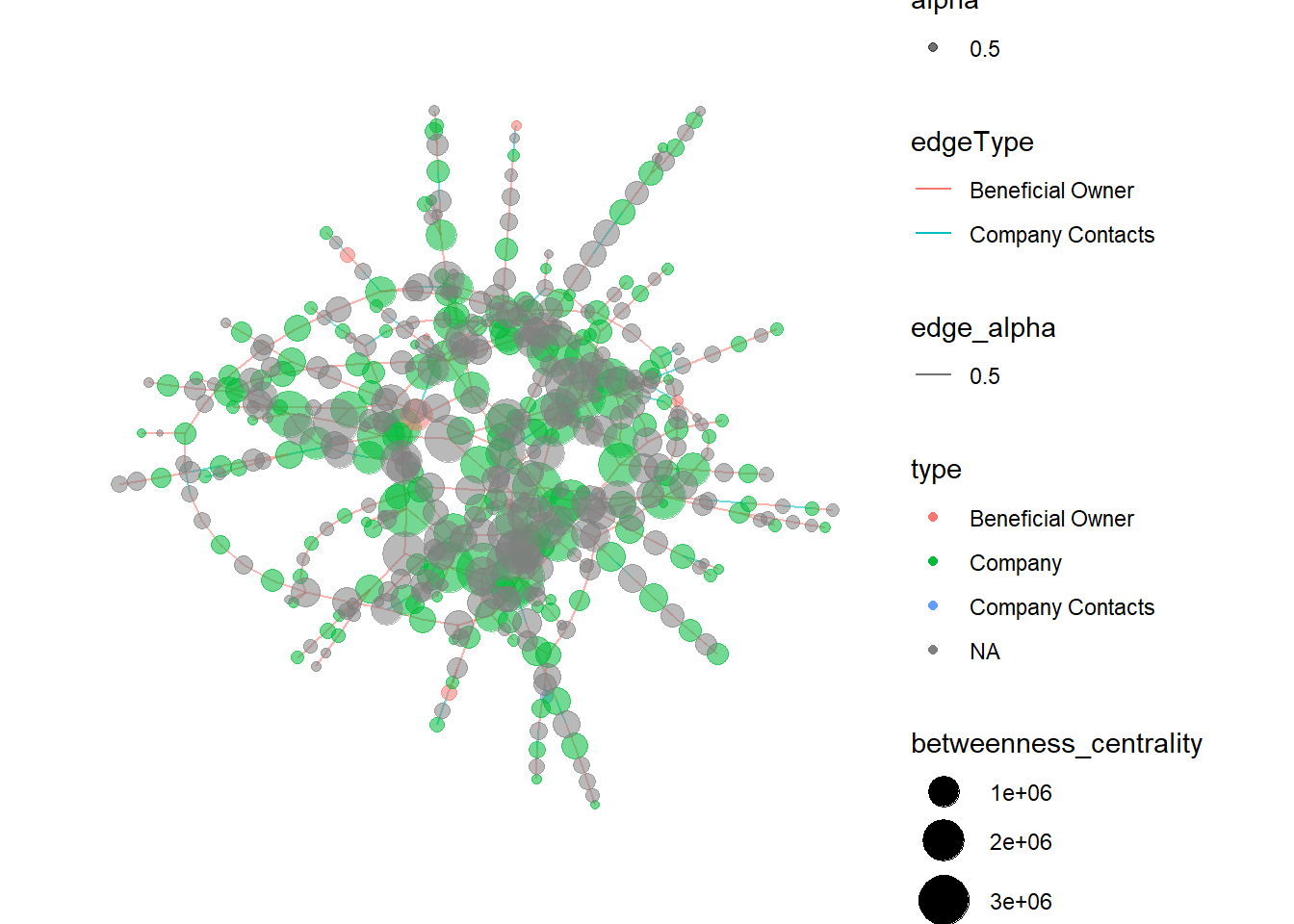 #extract all fish activy related source id5 <- MC3_edges_fishing %>%select(source, type = sourceNodeType) %>%rename(id = source)#extract all fish activity related target id6 <- MC3_edges_fishing %>%select(target, type = edgeType) %>%rename(id = target) MC3_nodes_fishNetwork2 <-rbind(id5, id6) %>%distinct() %>%left_join(MC3_nodes_clean,unmatched ="drop") mc3_graphFish2 <-tbl_graph(nodes = MC3_nodes_fishNetwork2,edges = MC3_edges_fishing,directed =FALSE) %>%mutate(betweenness_centrality =centrality_betweenness(),closeness_centrality =centrality_closeness()) mc3_graphFish2 %>%filter(betweenness_centrality >=2) %>%ggraph(layout ="as_star") +geom_edge_link(aes(alpha=0.5)) +geom_node_point(aes(size = betweenness_centrality,colour = type,alpha =0.5)) +scale_size_continuous(range=c(1,10))+theme_graph()