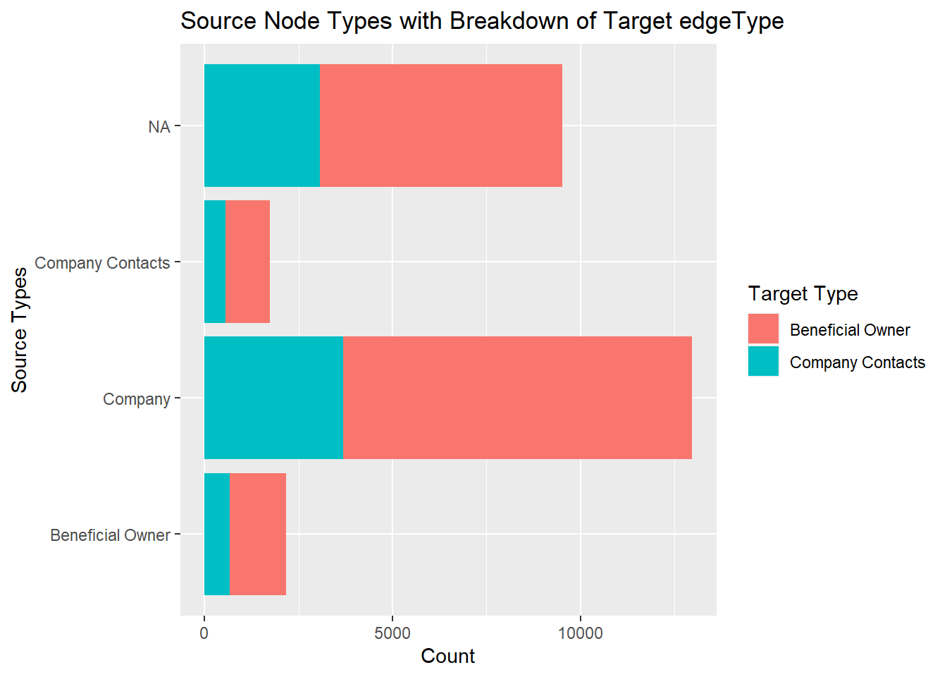 # Consolidate node information and add source node types, target node type will not be found from node join. Edge type is treated as the target type MC3_edges_clean_Join <- MC3_edges_clean %>%left_join(select(MC3_nodes_clean, #%>% filter(type == "Company"), id, sourceNodeType = type), by =c("source"="id")) %>%group_by(source, target, sourceNodeType) %>%filter(source != target) %>%distinct() %>%ungroup()# Plot the stacked bar chartggplot(data = MC3_edges_clean_Join, aes(x = sourceNodeType, fill = edgeType)) +geom_bar() +labs(title ="Source Node Types with Breakdown of Target edgeType",x ="Source Types",y ="Count") +scale_fill_discrete(name ="Target Type")+coord_flip()