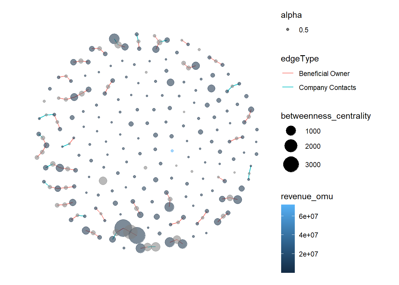 # Counting Beneficial Owner and Company Contacts for each company company_counts1 <- MC3_edges_fishing %>%filter(edgeType %in%c("Beneficial Owner", "Company Contacts")) %>%group_by(source, edgeType) %>%summarise(count =n()) %>%pivot_wider(names_from = edgeType, values_from = count, values_fill =0)%>%rename(numOfBenOwner ="Beneficial Owner", numOfComContact ="Company Contacts")# Counting companies owned by each Beneficial Owner owner_counts1 <- MC3_edges_fishing %>%filter(edgeType =="Beneficial Owner") %>%group_by(target) %>%summarise(numOfCompanyOwned =n_distinct(source))# Update the nodes with the count information, and take out Undesired companies MC3_nodes_fishupdated <- MC3_nodes_fishNetwork2 %>%left_join(company_counts1, by =c("id"="source")) %>%left_join(owner_counts1, by =c("id"="target")) %>%distinct(id, .keep_all =TRUE) %>%filter(!(type =="Company"& product_services %in%c("Unknown", "character(0)")))# # visNetwork(MC3_nodes_fishupdated_filtered,# MC3_edges_fishing)