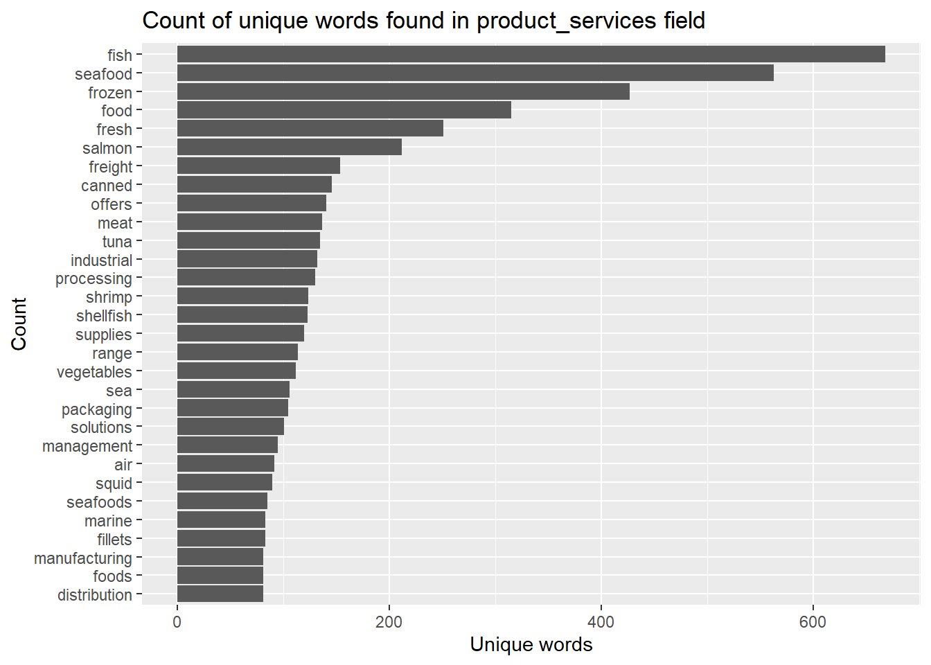 nodesToken %>%count(word, sort =TRUE) %>%top_n(30) %>%mutate(word =reorder(word, n)) %>%ggplot(aes(x = word, y = n)) +geom_col() +xlab(NULL) +coord_flip() +labs(x ="Count",y ="Unique words",title ="Count of unique words found in product_services field")
