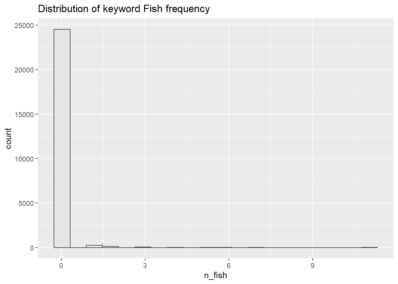#start a bit of text sensing, display the result by max value first MC3_nodes1 <- MC3_nodes_clean %>%mutate(n_fish =str_count(product_services, "fish")) %>%arrange(desc(n_fish))library(ggplot2)ggplot(data = MC3_nodes1, aes(x = n_fish)) +geom_histogram(bins=20, boundary =20,color="grey25", fill="grey90") +ggtitle("Distribution of keyword Fish frequency")