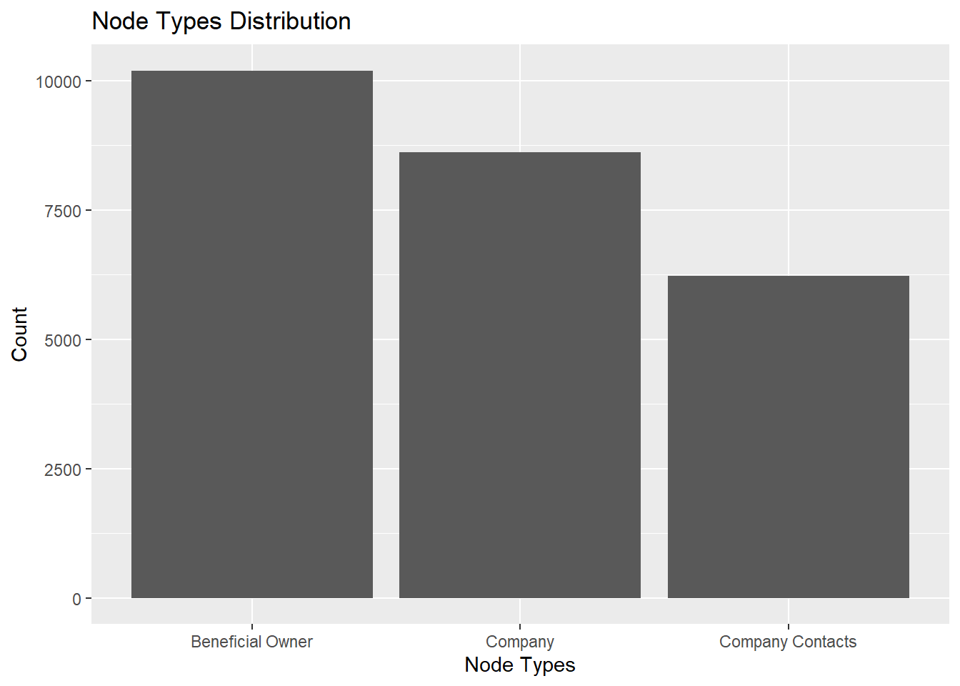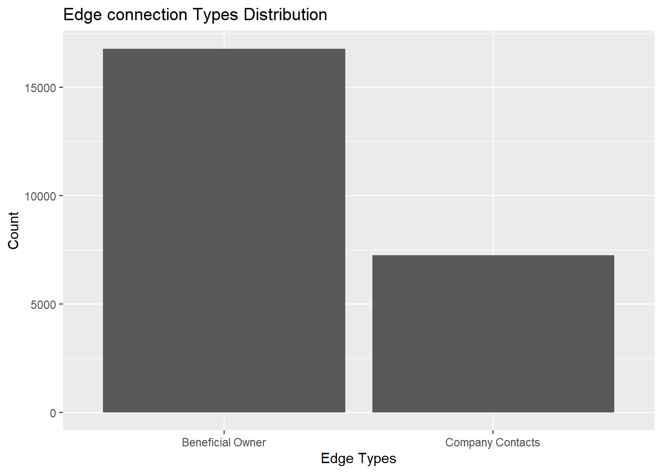 # Counting Beneficial Owner and Company Contacts for each company company_counts <- MC3_edges_clean %>%filter(edgeType %in%c("Beneficial Owner", "Company Contacts")) %>%group_by(source, edgeType) %>%summarise(count =n()) %>%pivot_wider(names_from = edgeType, values_from = count, values_fill =0)# Counting companies owned by each Beneficial Owner owner_counts <- MC3_edges_clean %>%filter(edgeType =="Beneficial Owner") %>%group_by(target) %>%summarise(numOfCompanyOwned =n_distinct(source))# Update the nodes with the count information MC3_nodes_updated <- MC3_nodes_clean %>%left_join(company_counts, by =c("id"="source")) %>%left_join(owner_counts, by =c("id"="target"))