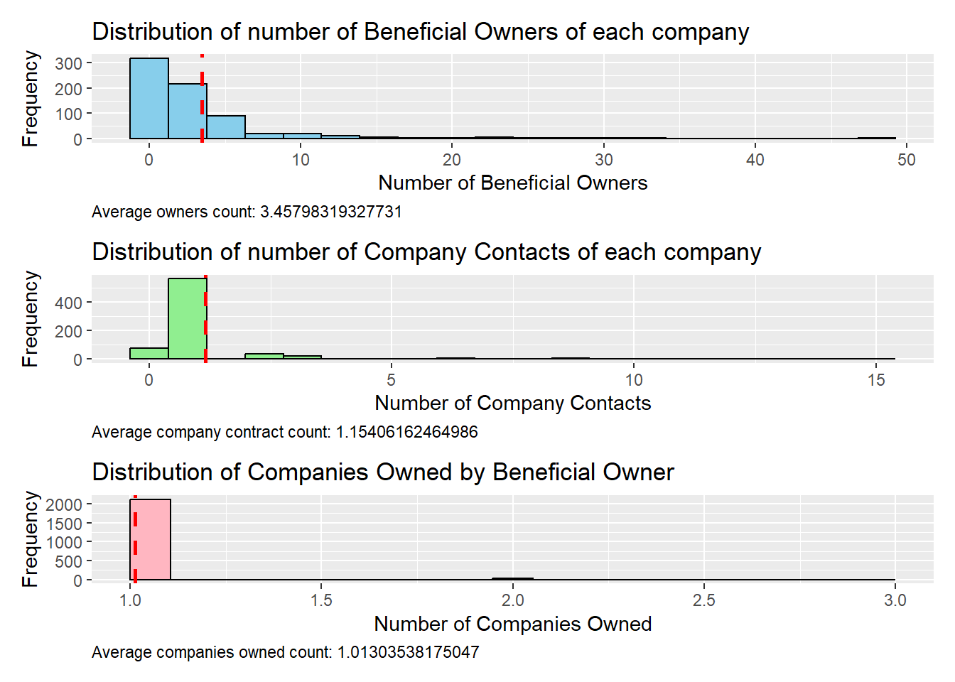 library(patchwork)# Calculate average values avg_ben_owner <-mean(MC3_nodes_fishupdated$numOfBenOwner, na.rm =TRUE) avg_com_contact <-mean(MC3_nodes_fishupdated$numOfComContact, na.rm =TRUE) avg_company_owned <-mean(MC3_nodes_fishupdated$numOfCompanyOwned, na.rm =TRUE)# Create separate histogram plots hist1 <-ggplot(MC3_nodes_fishupdated) +geom_histogram(aes(x = numOfBenOwner), fill ="skyblue", color ="black", bins =20) +geom_vline(xintercept = avg_ben_owner, color ="red", linetype ="dashed", size =1) +labs(title ="Distribution of number of Beneficial Owners of each company",x ="Number of Beneficial Owners",y ="Frequency",caption =paste("Average owners count:", avg_ben_owner)) +theme(plot.caption =element_text(hjust =0)) hist2 <-ggplot(MC3_nodes_fishupdated) +geom_histogram(aes(x = numOfComContact), fill ="lightgreen", color ="black", bins =20) +geom_vline(xintercept = avg_com_contact, color ="red", linetype ="dashed", size =1) +labs(title ="Distribution of number of Company Contacts of each company",x ="Number of Company Contacts",y ="Frequency",caption =paste("Average company contract count:", avg_com_contact)) +theme(plot.caption =element_text(hjust =0)) hist3 <-ggplot(MC3_nodes_fishupdated) +geom_histogram(aes(x = numOfCompanyOwned), fill ="lightpink", color ="black", bins =20) +geom_vline(xintercept = avg_company_owned, color ="red", linetype ="dashed", size =1) +labs(title ="Distribution of Companies Owned by Beneficial Owner",x ="Number of Companies Owned",y ="Frequency",caption =paste("Average companies owned count:", avg_company_owned)) +theme(plot.caption =element_text(hjust =0))# Arrange the plots vertically hist_combined <- hist1 / hist2 / hist3 +plot_layout(nrow =3) hist_combined