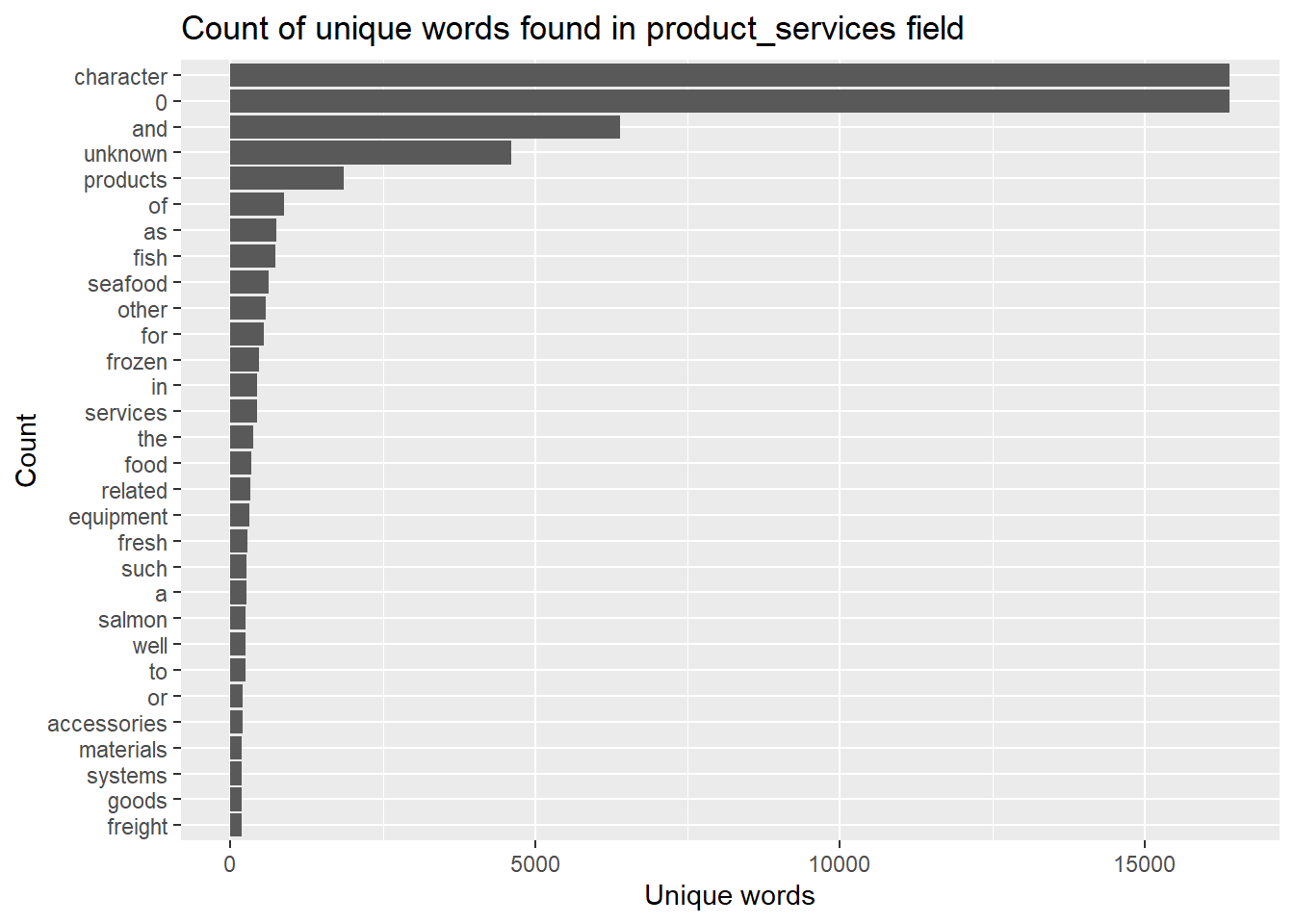 tidy_stopwords %>%count(word, sort =TRUE) %>%top_n(30) %>%mutate(word =reorder(word, n)) %>%ggplot(aes(x = word, y = n)) +geom_col() +xlab(NULL) +coord_flip() +labs(x ="Count",y ="Unique words",title ="Count of unique words found in product_services field")